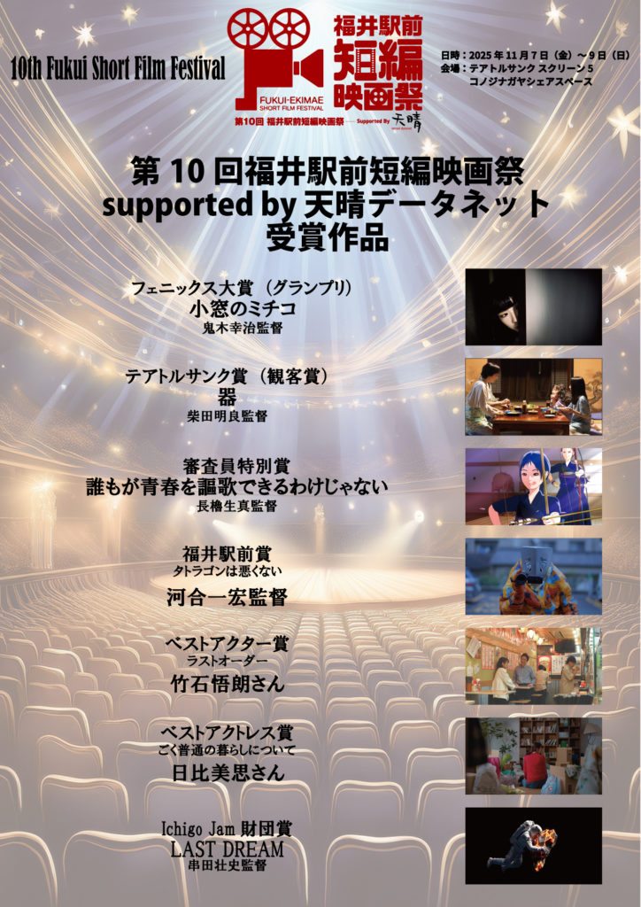 この度は「第10回福井駅前短編映画祭 supported by 天晴データネット」へのご参加ありがとうございました。受賞作品の発表をいたします。来年も11月に予定をしておりますので、ぜひご応募、ご参加、お待ちしています。また、今回の映画祭に際して、ブログを書きましたので、お時間があるときにでもご一読いただけますと幸甚です。